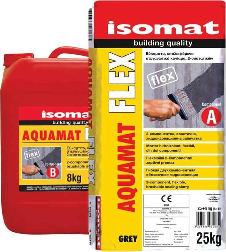 AQUAMAT-FLEX este un mortar flexibil, hidroizolant, bicomponent. Se compune dintr-un mortar pe bază de ciment (componenta A) şi o emulsie cu răşini (componenta Β). După întărire, formează o membrană fără rosturi şi îmbinări, care conferă următoarele avantaje:
